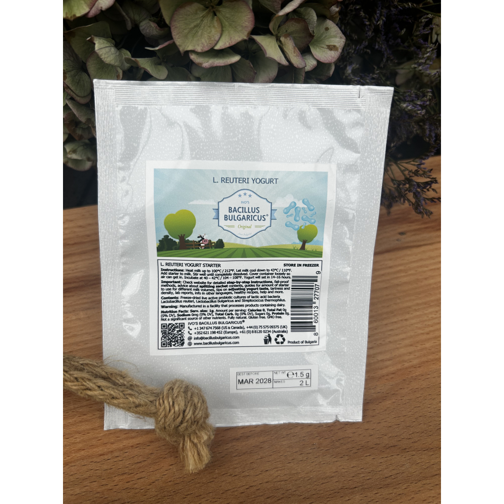 De yoghurt die je met deze starter maakt, is glad, aangenaam zuur en van nature dik, met de zachte, frisse smaak van traditionele Bulgaarse yoghurt en de kenmerkende vitaliteit van Lactobacillus reuteri.Deze bacterie komt van nature voor in de menselijke darmen en helpt een gezond evenwicht van goede bacteriën te behouden, ondersteunt de spijsvertering en versterkt de natuurlijke afweer van het lichaam. In combinatie met Lactobacillus bulgaricus vormen ze een ware krachtpatser – een yoghurt die niet alleen rijk, romig en smaakvol is, maar ook uitzonderlijk goed voor de darmgezondheid en het algehele welzijn.